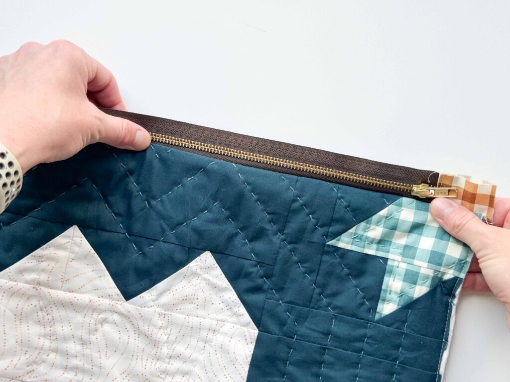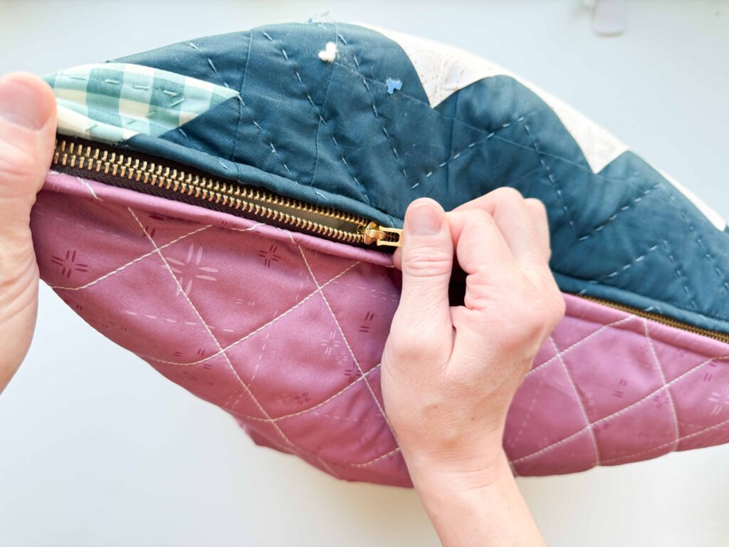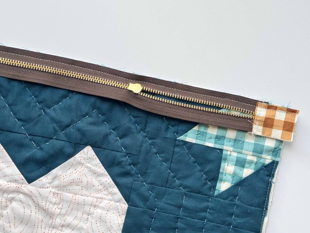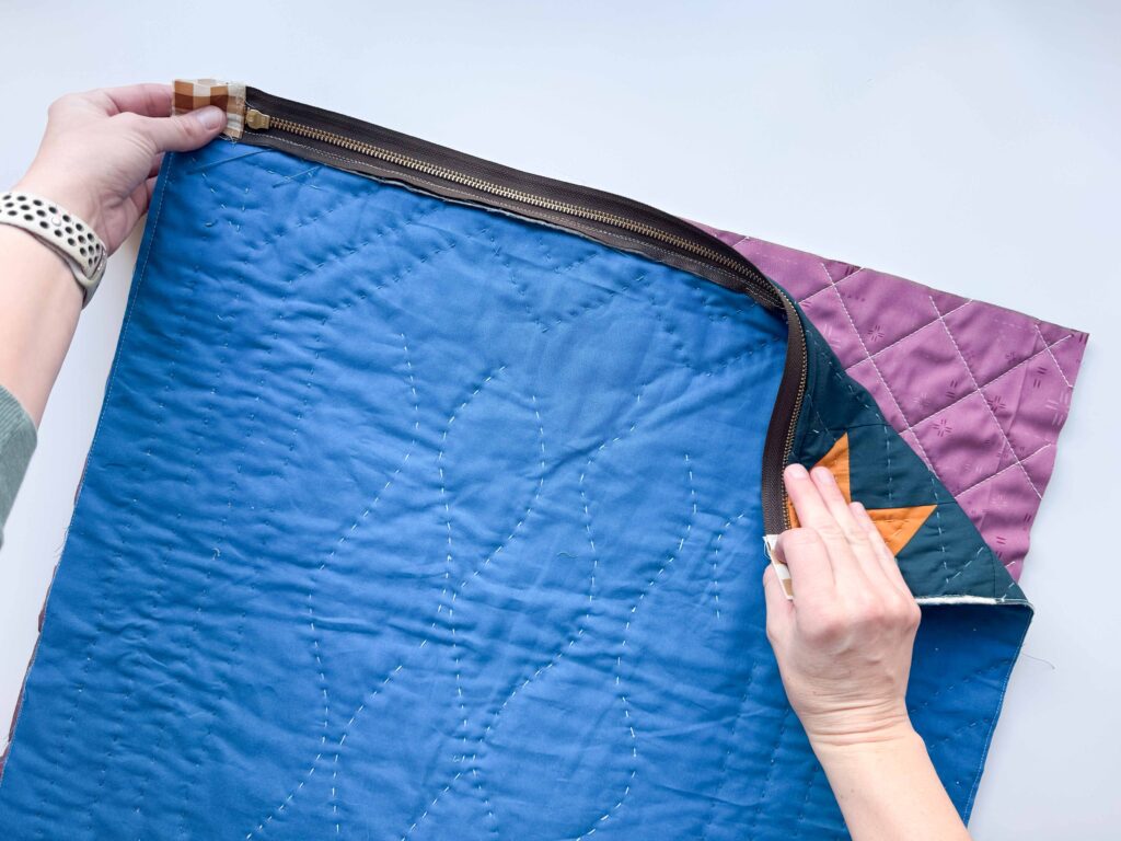 Once both sides are attached, fold each quilted panel back so the folded edge partially covers the zipper. This creates a partially hidden zipper.