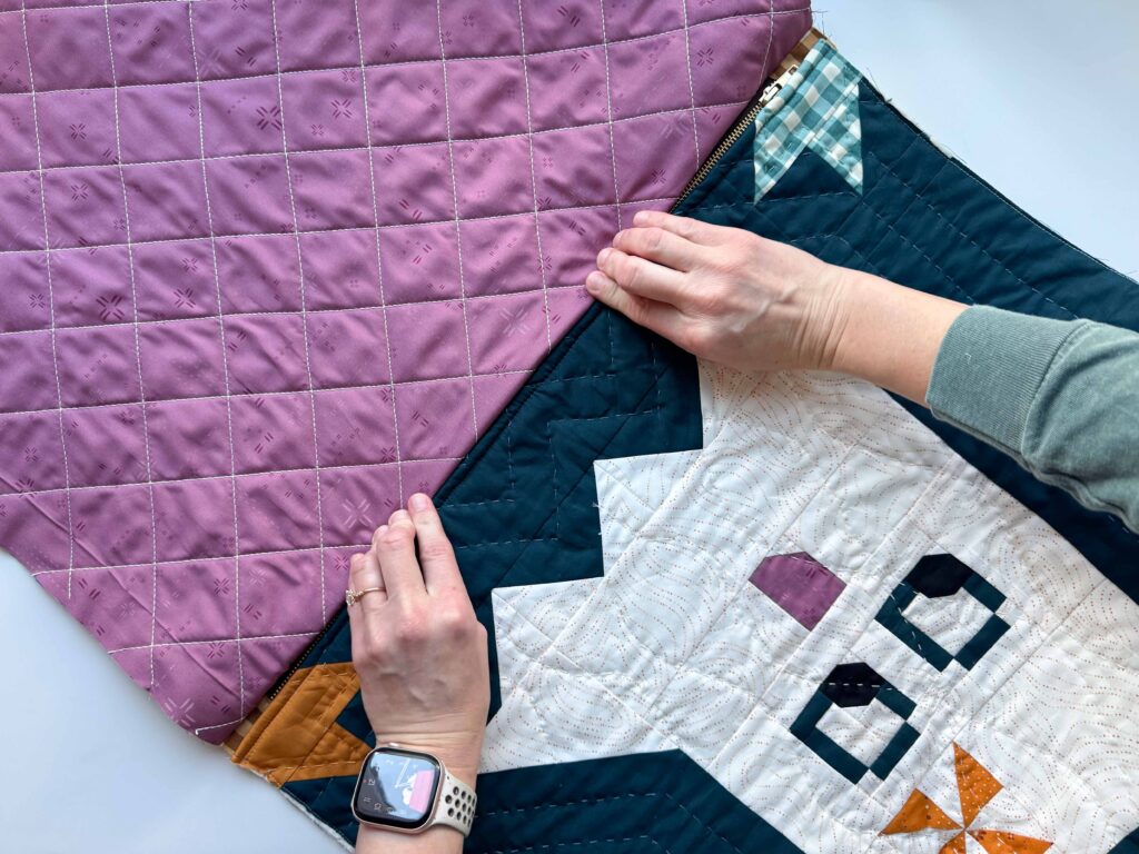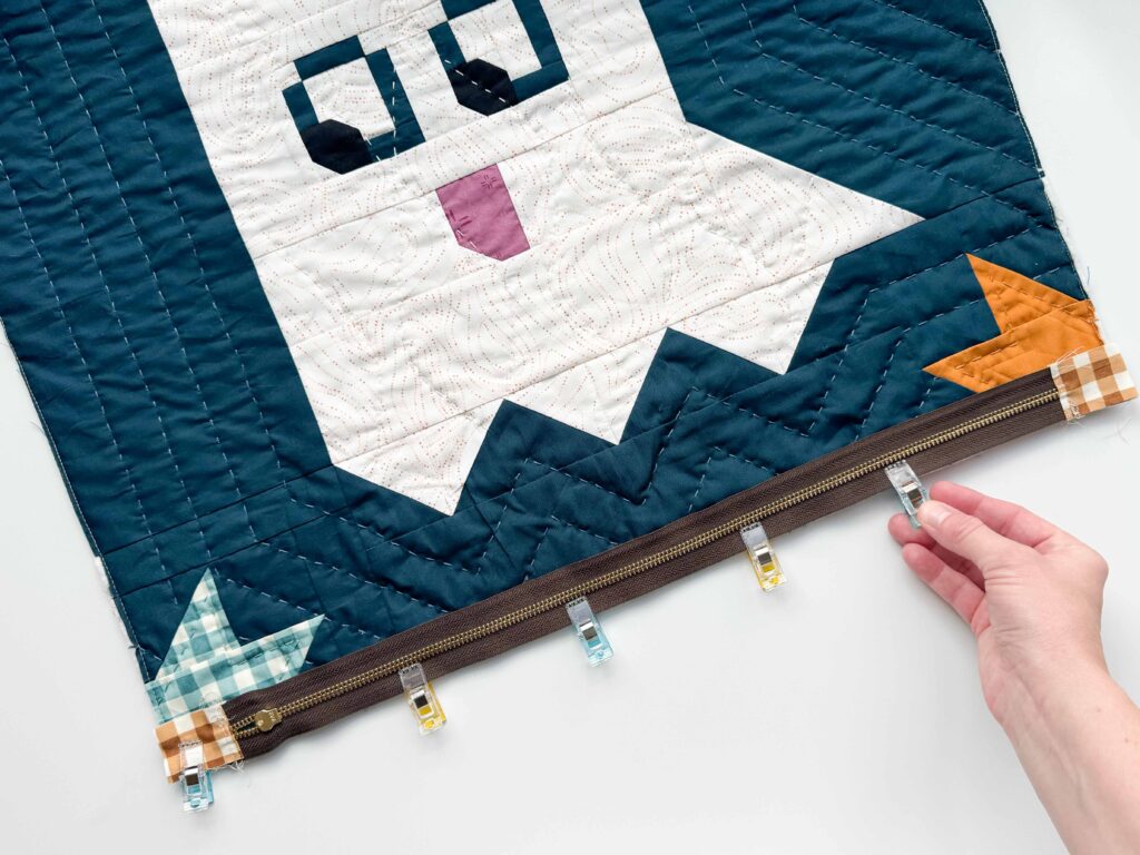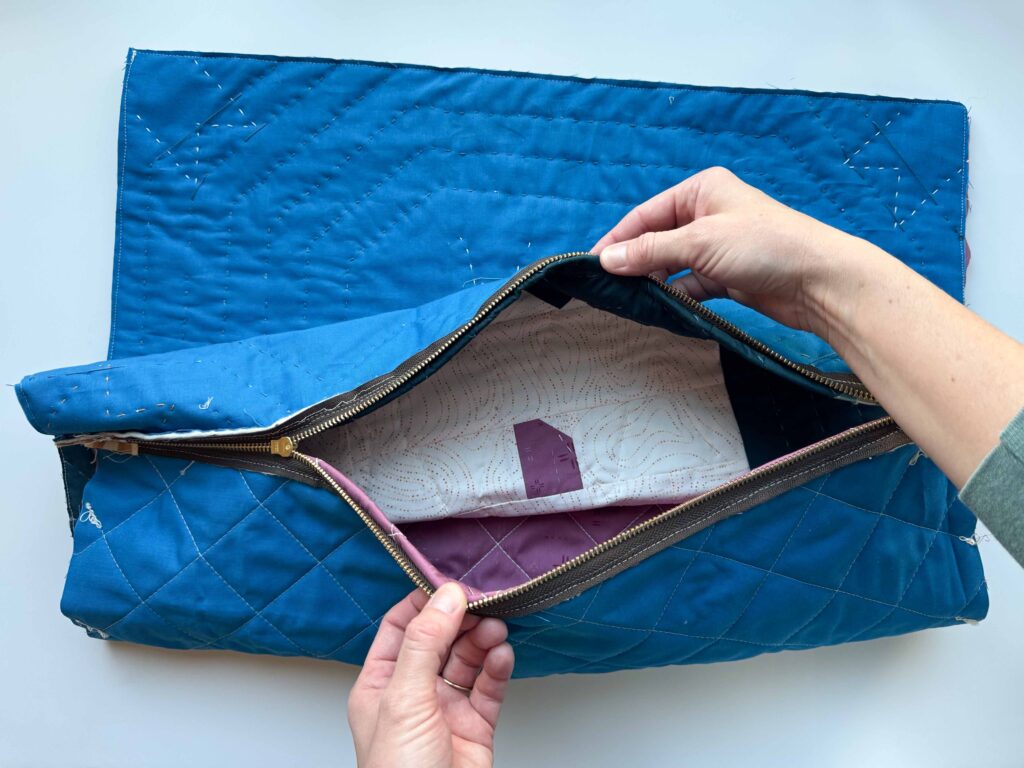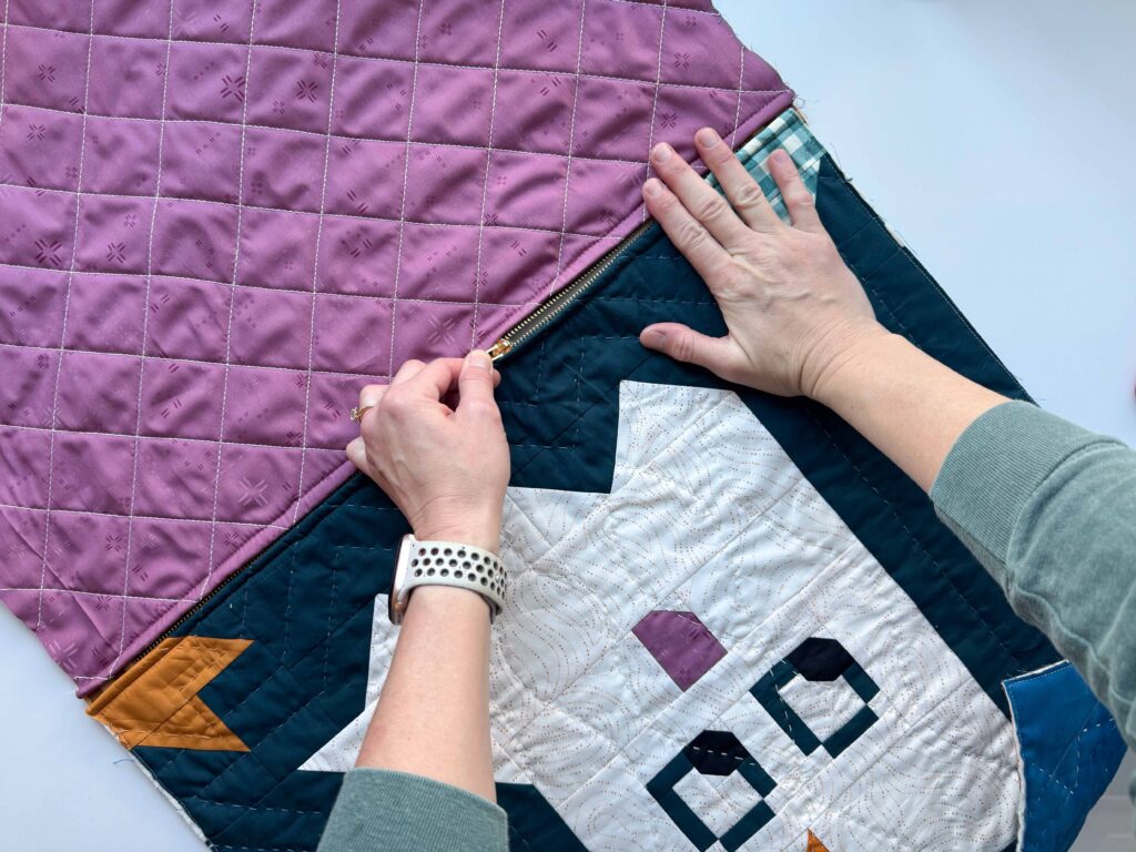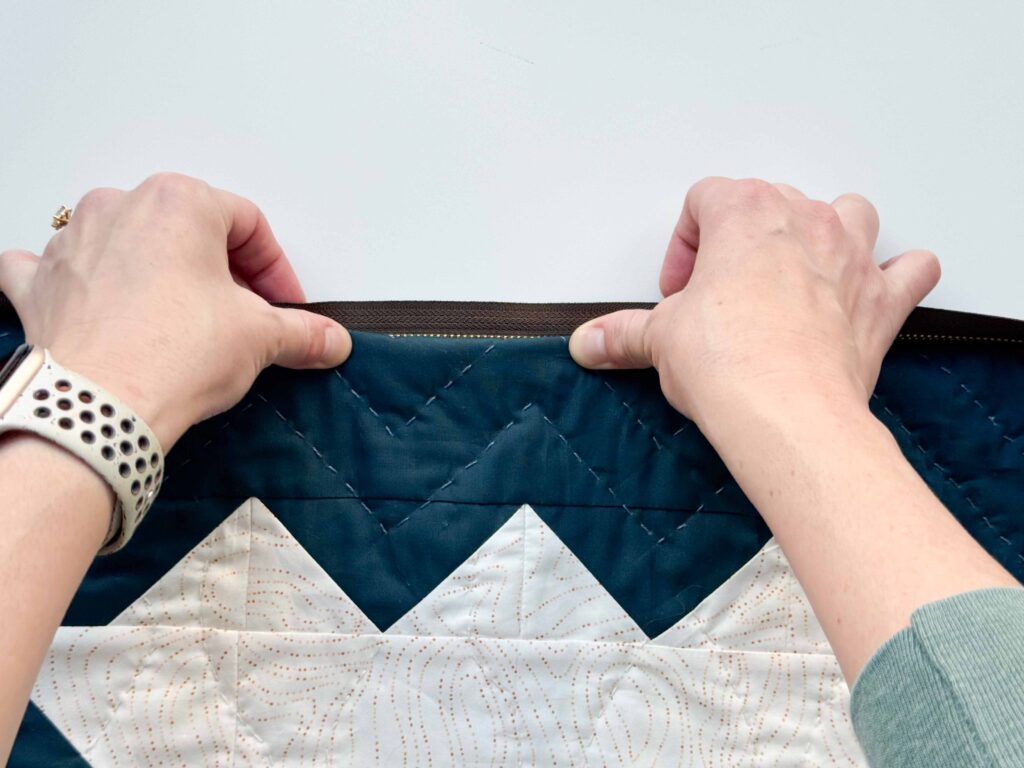 Once both sides are attached, fold each quilted panel back so the folded edge partially covers the zipper. This creates a partially hidden zipper.