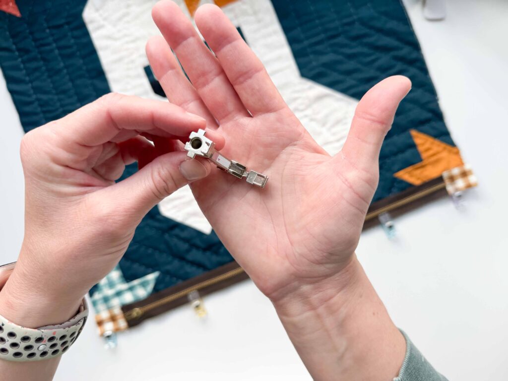- Trim away the zipper’s metal stop if needed (make sure your zipper pull is in the middle!).