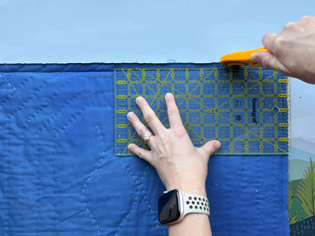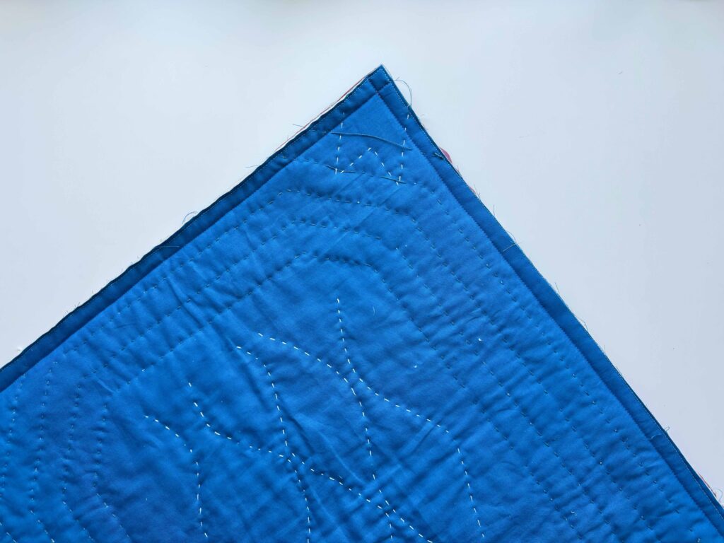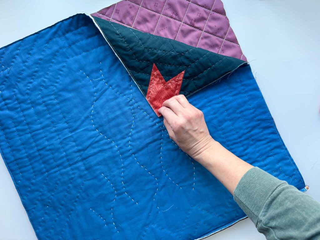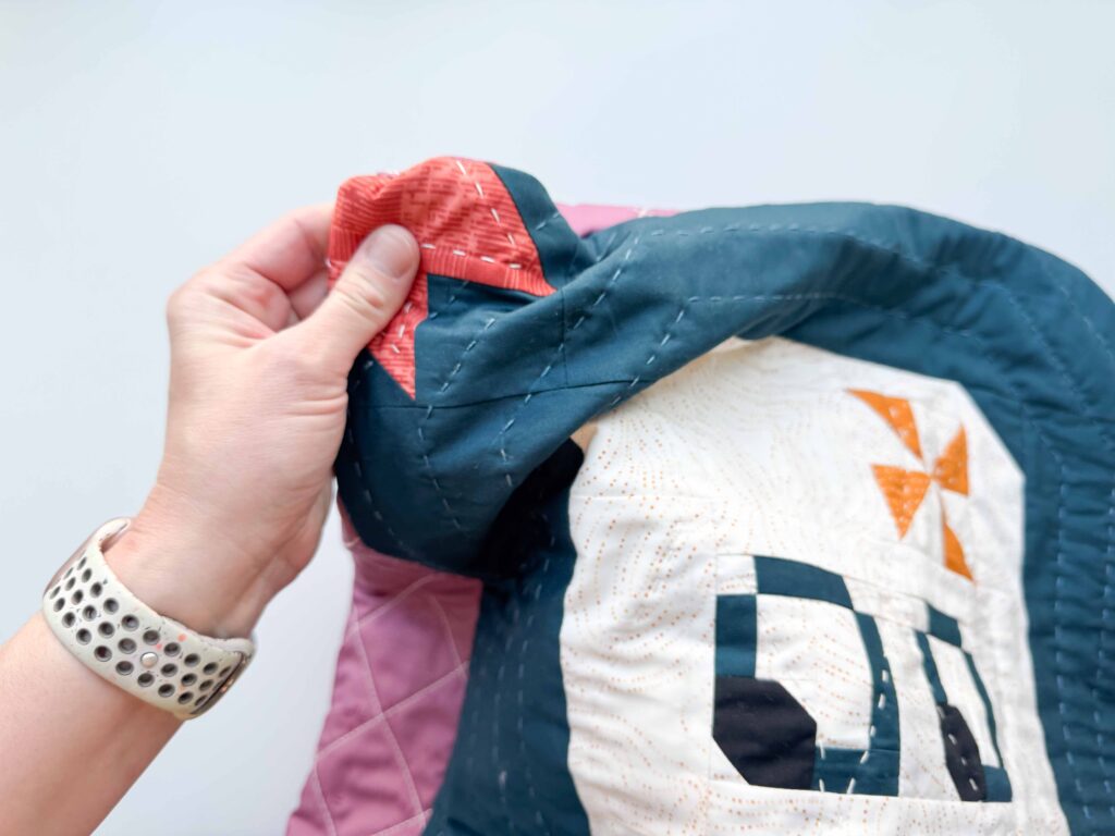 Baste the layers together using your favorite method (spray, pins, or basting stitches). Then quilt however your Scout heart desires — straight lines, grids, or something free-motion and fancy. I hand-quilted mine using Aurifil’s new 8wt thread. Once quilted, trim and square the block to 22″ × 22″.
