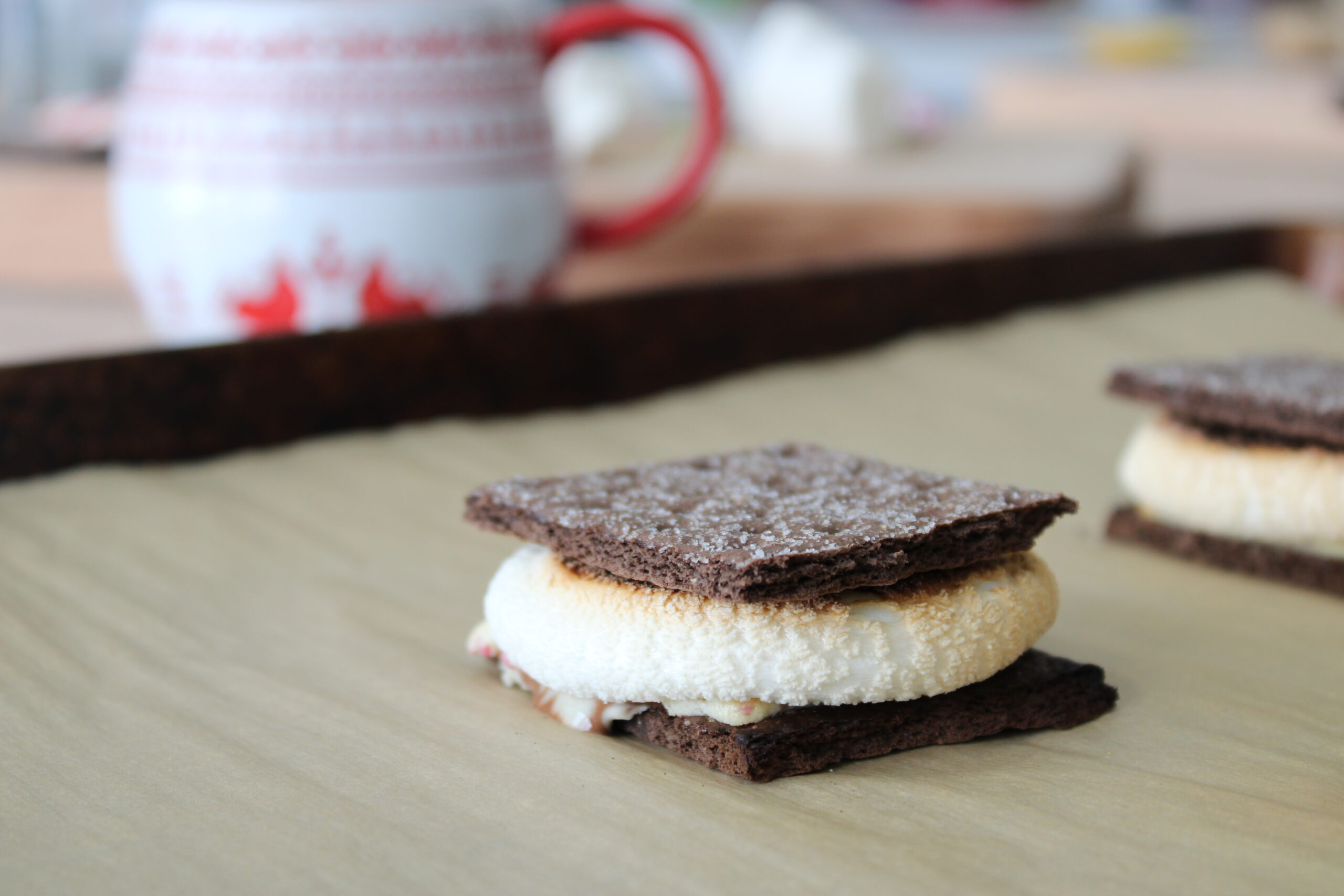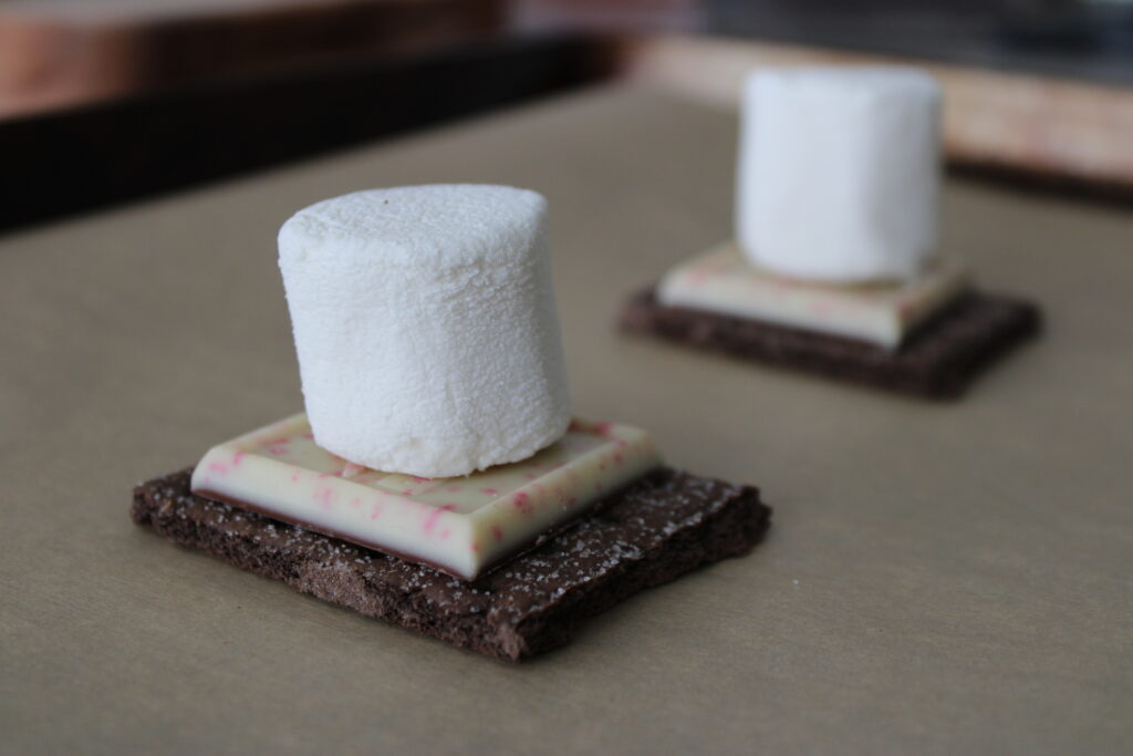 - Arrange 4 graham cracker halves on the sheet and top each with a peppermint bark square and a marshmallow.